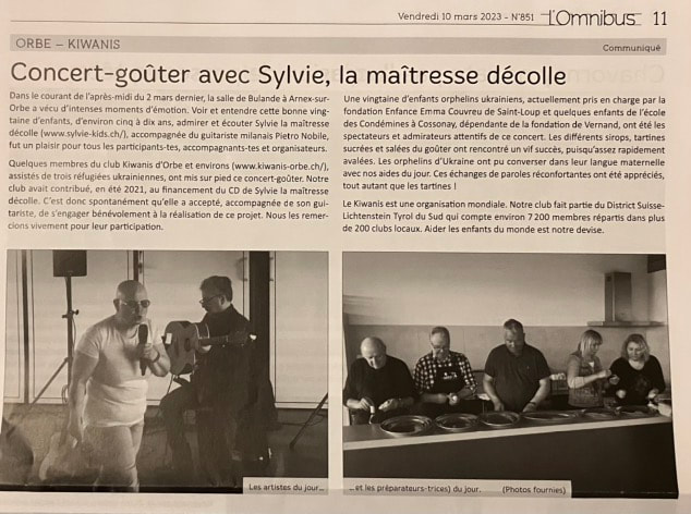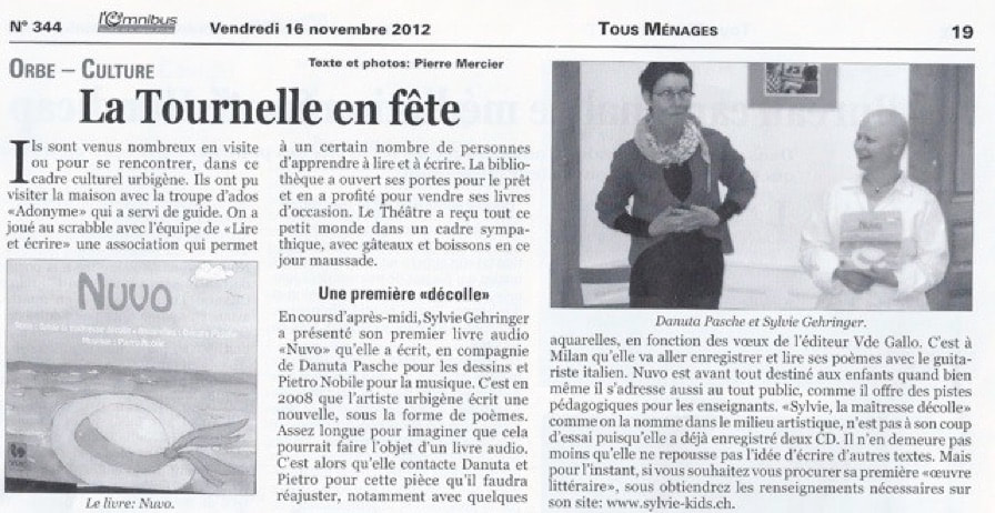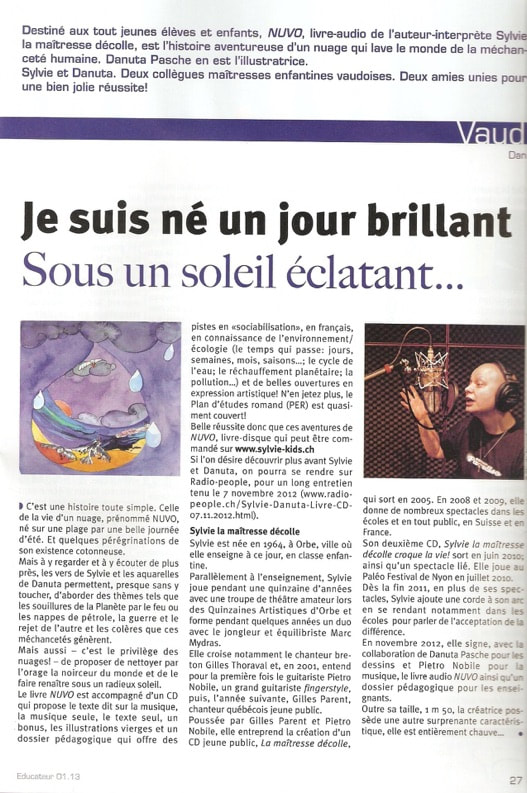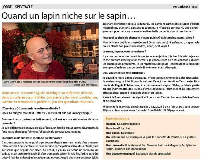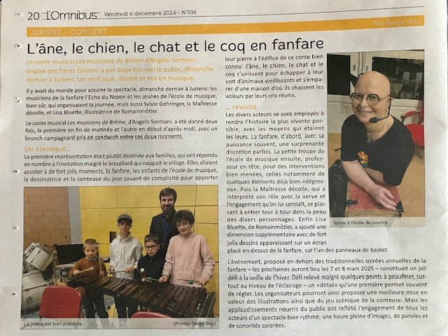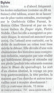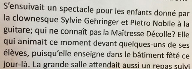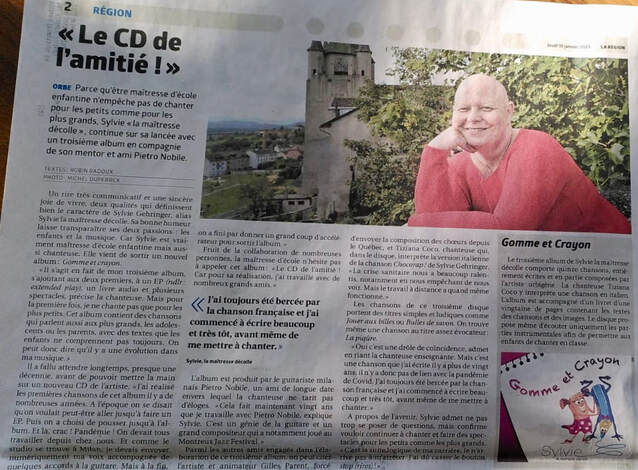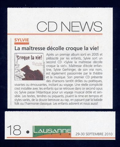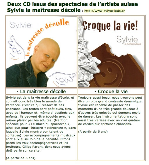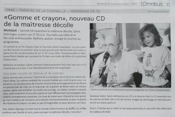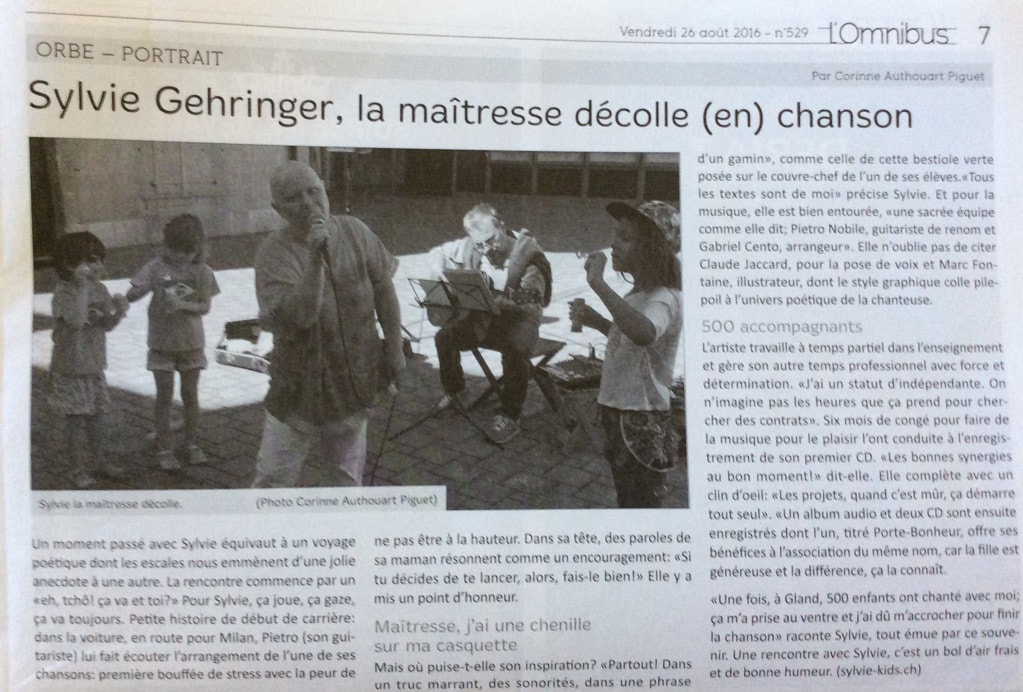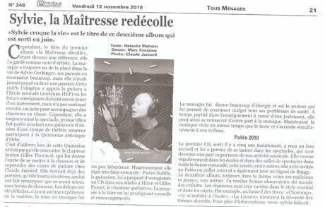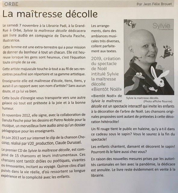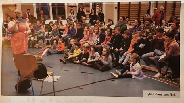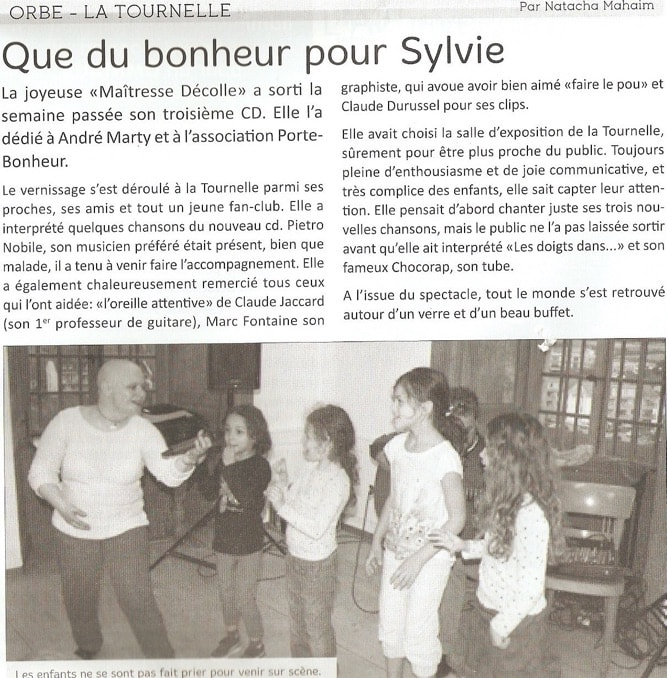 Sylvie Gerhinger, de son vrai nom, maîtresse d’école enfantine de son état, (plus joli, qu’enseignante au CIN), a inauguré son nouveau cd, Sylvie la maîtresse décolle croque la vie !, à la Tournelle samedi passé. Le théâtre était plus bruyant qu’une classe, grouillant de jeunes fans et de leurs parents et amis de la Maîtresse Décolle, mais très attentif dès les premières notes.