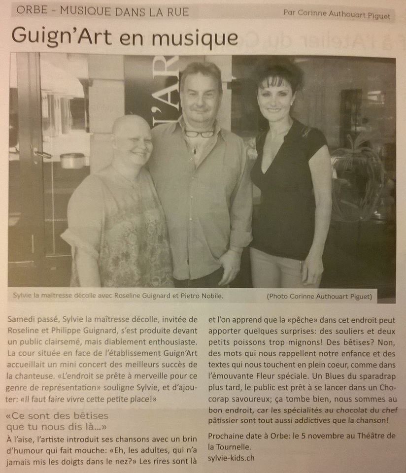 Avec son matelot-guitariste et faisant venir, à la nage bien sûr, des enfants sur scène avec des tâches très précises à accomplir, colorier la grande voile et la cabine, l’aider à manger du chocolat (chocorap)ou encore trier des chaussettes pour mémé, le voyage s’est déroulé sans accrocs. Et le capitaine Sylvie a accosté tout en douceur au pays des caribous pour aller voir sa mémé. En bis, le public a réclamé, Les doigts dans le nez, tube de son premier album. Un goûter et une séance de dédicaces étaient offerts après le spectacle. Le soir a eu encore lieu une seconde session de vernissage où les amis et les fans se sont réunis pour écouter quelques chansons et partager un moment en toute convivialité.